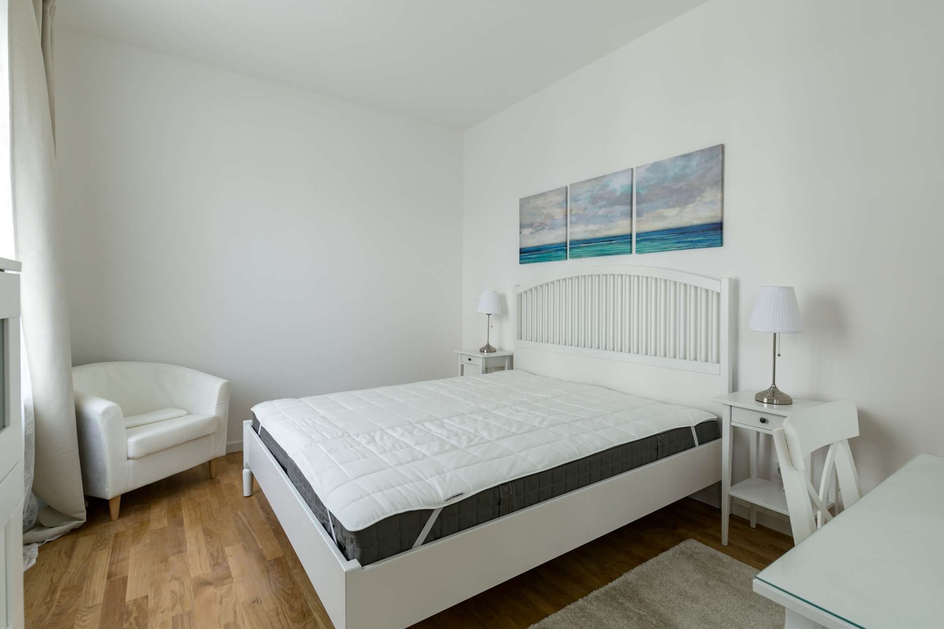 Das Schlafzimmer bietet ausreichend Platz für ein großes Bett und einen Kleiderschrank. Die separate Küche ist mit modernen Einbaugeräten ausgestattet und bietet genügend Stauraum für Küchenutensilien. Das Badezimmer verfügt über eine Badewanne, ein Waschbecken und ein WC.
